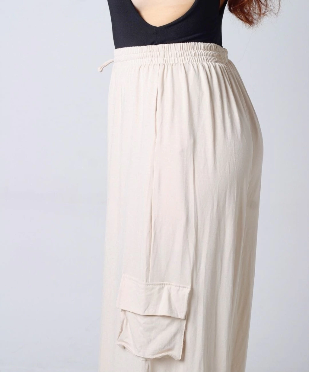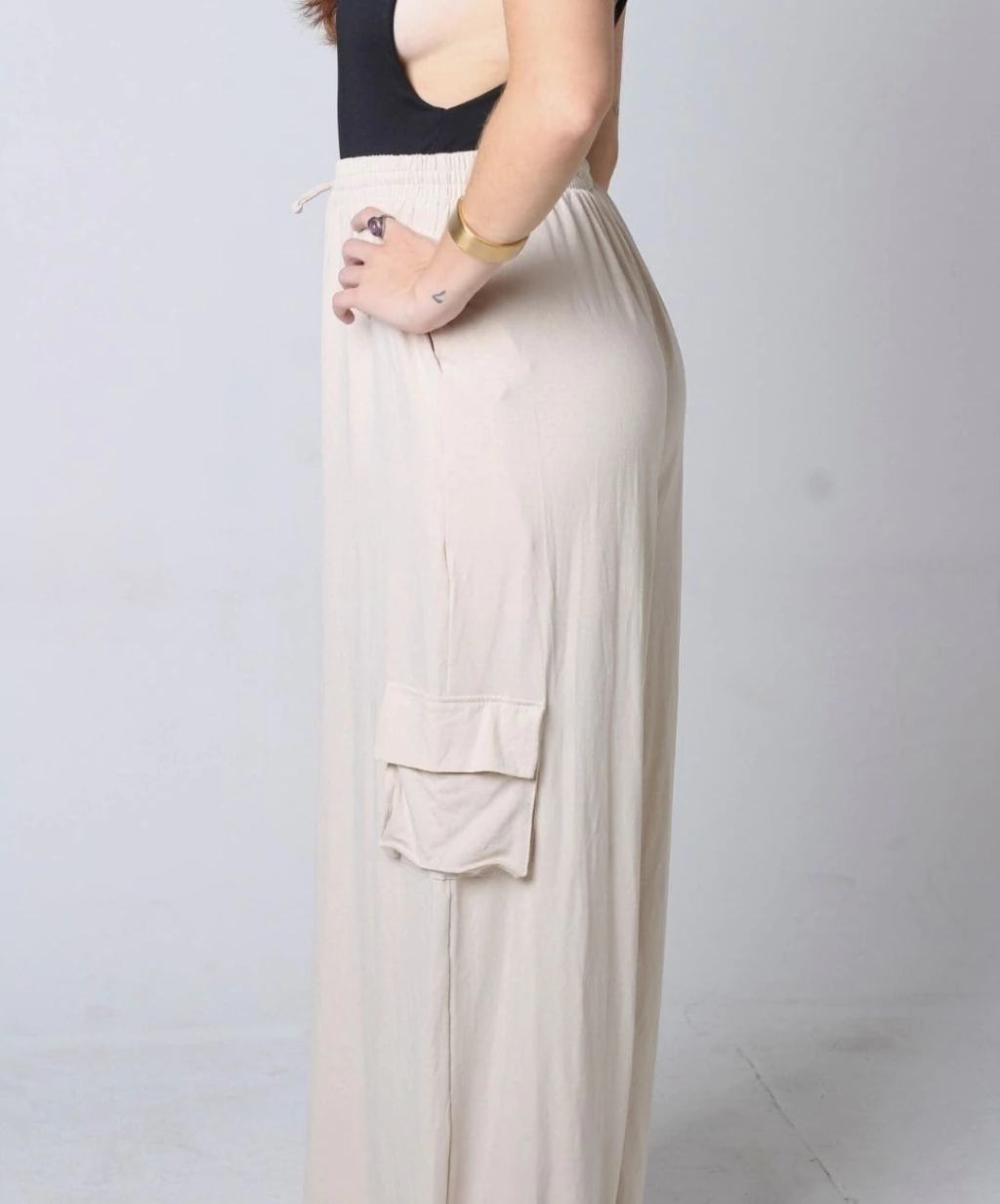 A peça perfeita para compor looks elegantes com conforto absoluto! A modelagem pantalona alonga a silhueta, enquanto os bolsos cargo trazem um toque moderno e utilitário.
